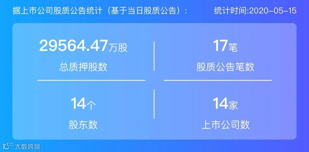 2020年5月15日,股票质押总质押股数29564.47万股,上市公司数14家,股质公告笔数17笔,股东数14个。