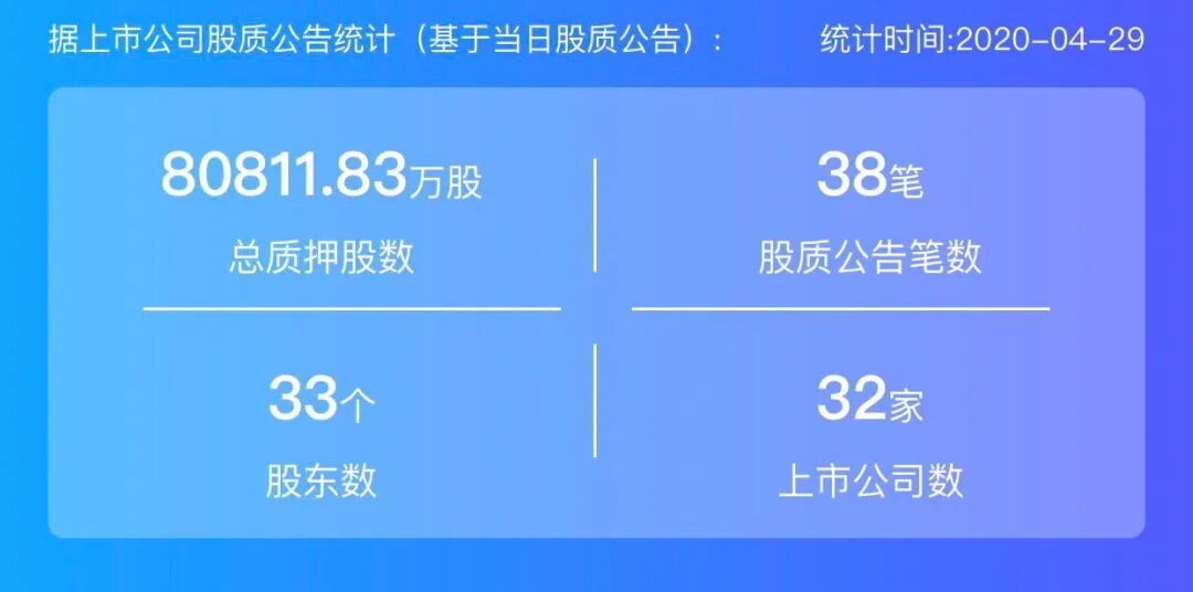 2020年4月29日,股票质押总质押股数80811.83万股,上市公司数32家,股质公告笔数38笔,股东数33个。