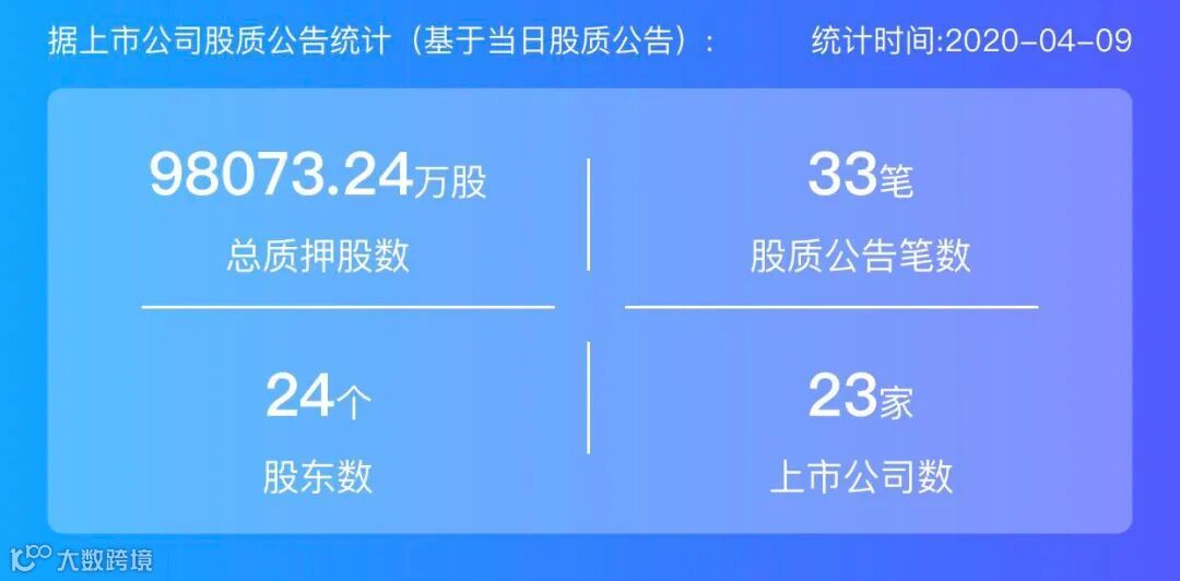 2020年4月9日,股票质押总质押股数98073.24万股,上市公司数23家,股质公告笔数33笔,股东数24个。