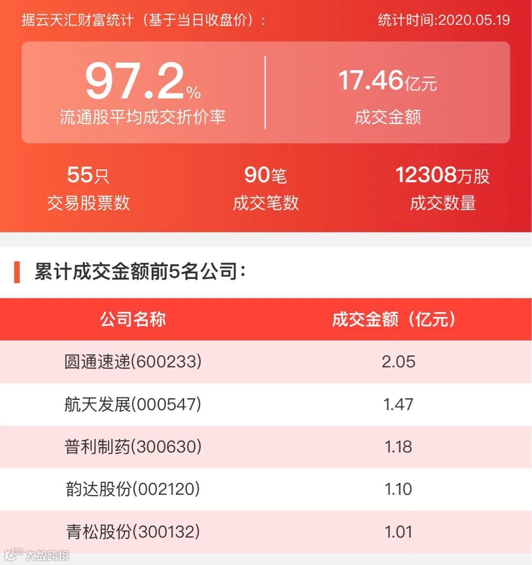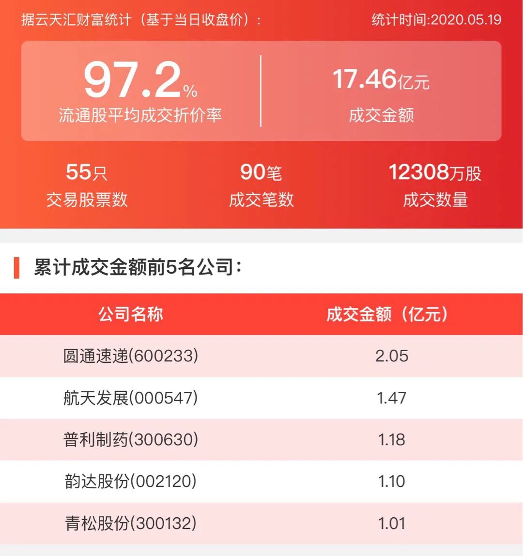 2020年5月19日,大宗交易成交金额17.46亿元,交易股票数55只,成交笔数90笔,流通股平均成交折价率97.2%,成交数量12308万股。