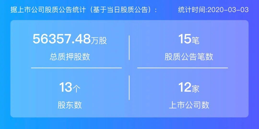 2020年3月3日,股票质押总质押股数56357.48万股,上市公司数12家,股质公告笔数15笔,股东数13个。