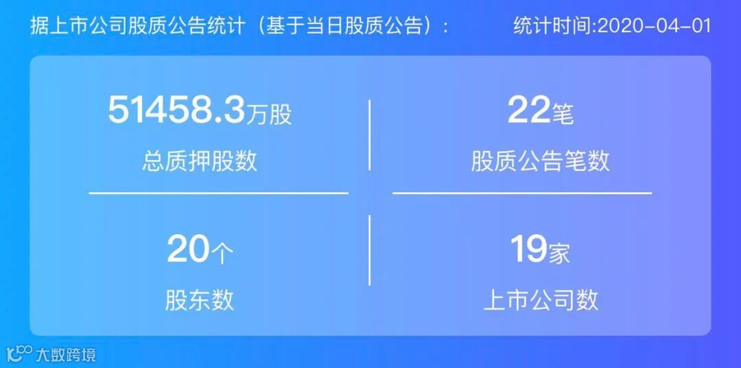2020年4月1日,股票质押总质押股数51458.3万股,上市公司数19家,股质公告笔数22笔,股东数20个。