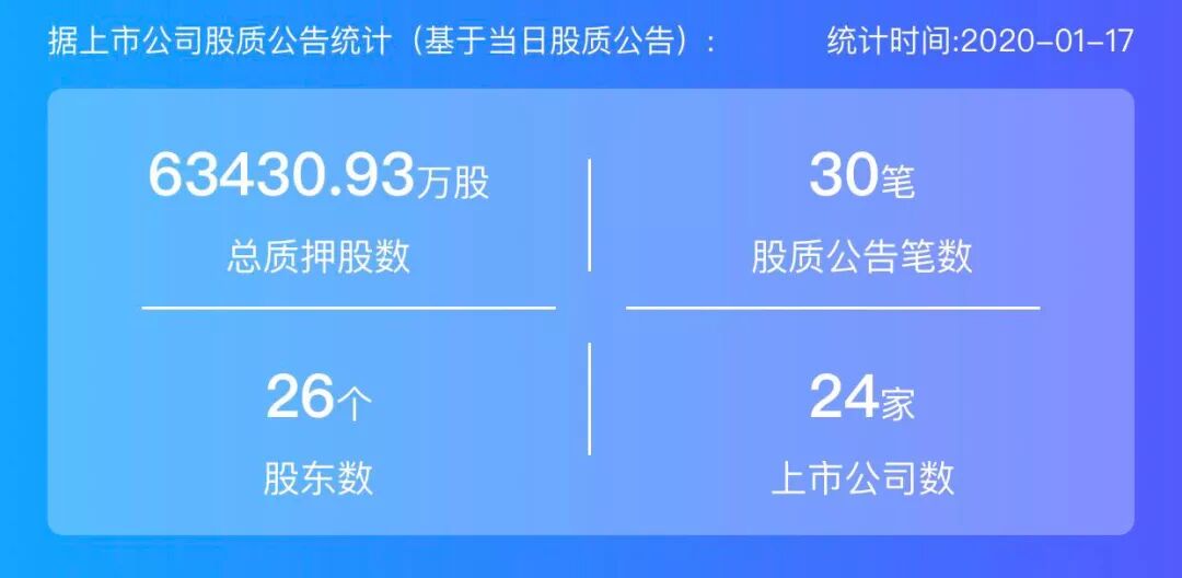 2020年1月17日,股票质押总质押股数63430.93万股,上市公司数24家,股质公告笔数30笔,股东数26个。