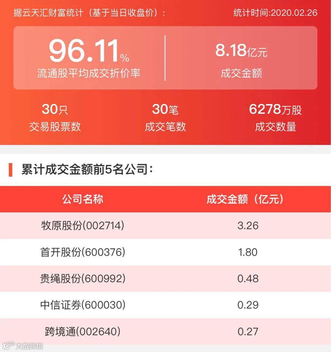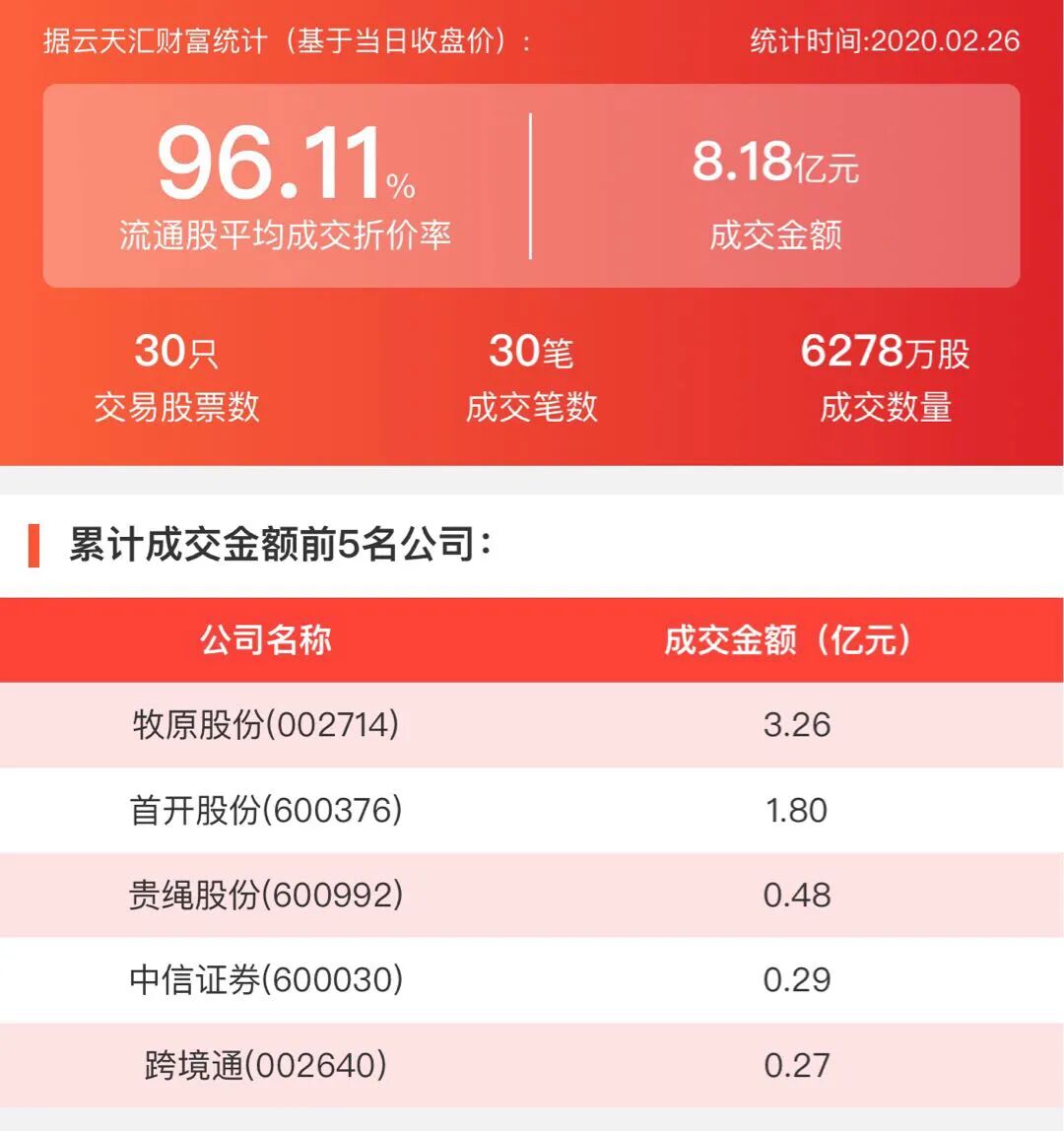 2020年2月26日,大宗交易成交金额8.18亿元,交易股票数30只,成交笔数30笔,流通股平均成交折价率96.11%,成交数量6278万股。