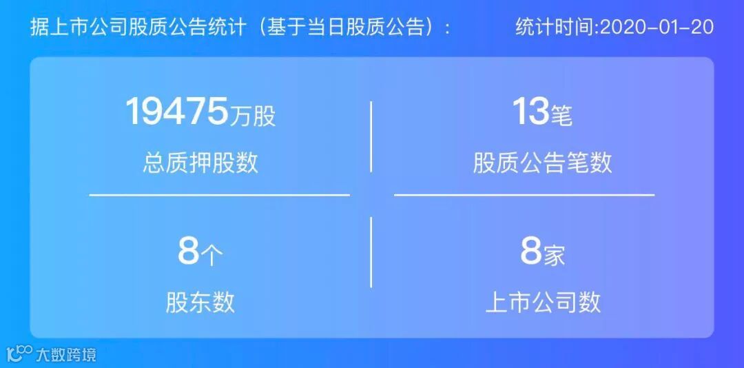 2020年1月20日,股票质押总质押股数19475万股,上市公司数8家,股质公告笔数13笔,股东数8个。
