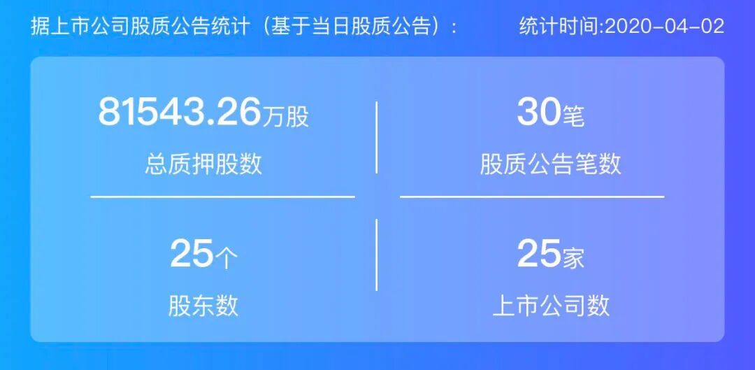 2020年4月2日,股票质押总质押股数81543.26万股,上市公司数25家,股质公告笔数30笔,股东数25个。