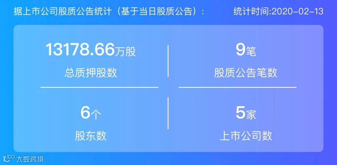 2020年2月13日,股票质押总质押股数13178.66万股,上市公司数5家,股质公告笔数9笔,股东数6个。