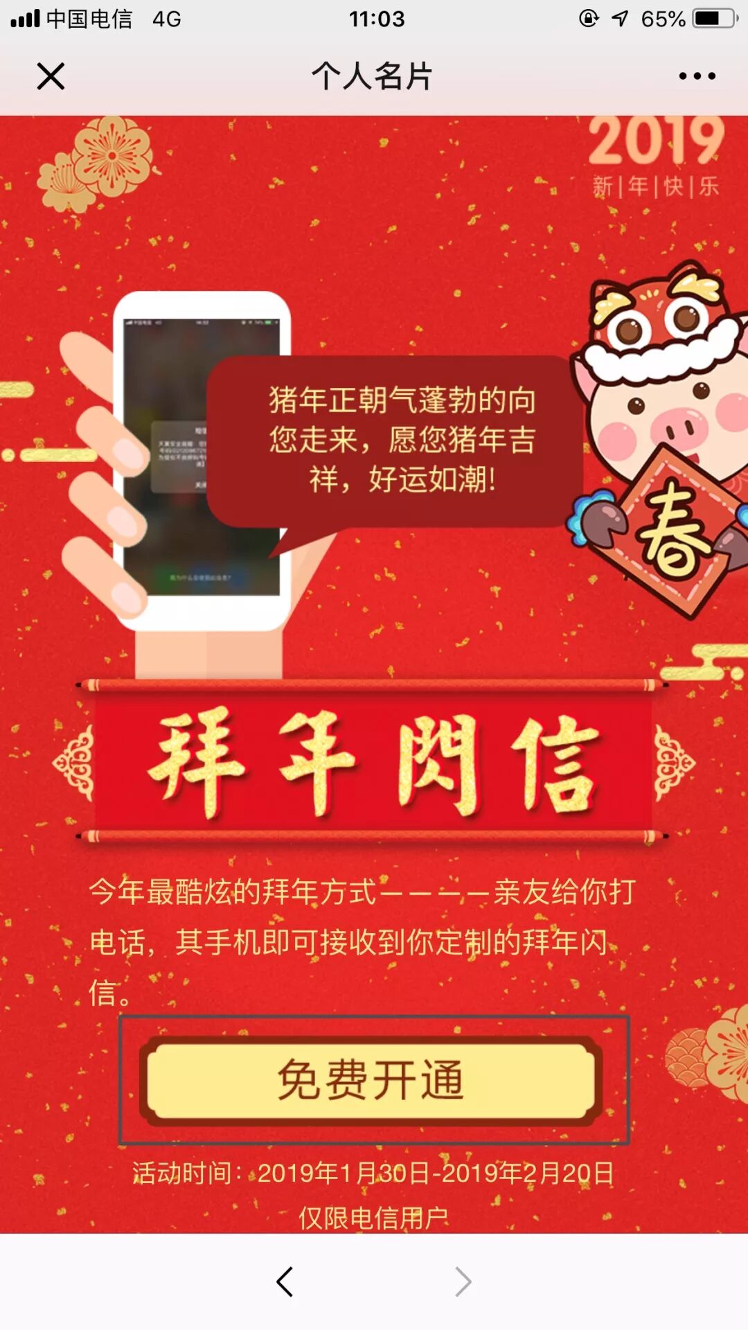 只要你开通了个人名片免费拜年闪信,对方给你拨打电话的时候就能收到你定制的新年祝福啦^@^