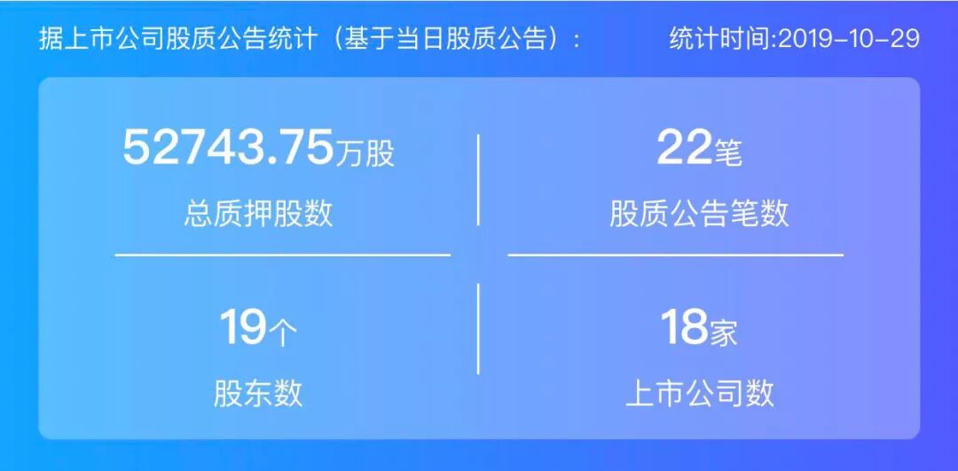2019年10月29日,股票质押总质押股数52743.75万股,上市公司数18家,股质公告笔数22笔,股东数19个。