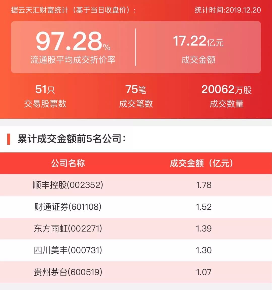 2019年12月20日,大宗交易成交金额17.22亿元,交易股票数51只,成交笔数75笔,流通股平均成交折价率97.28%,成交数量20062万股。