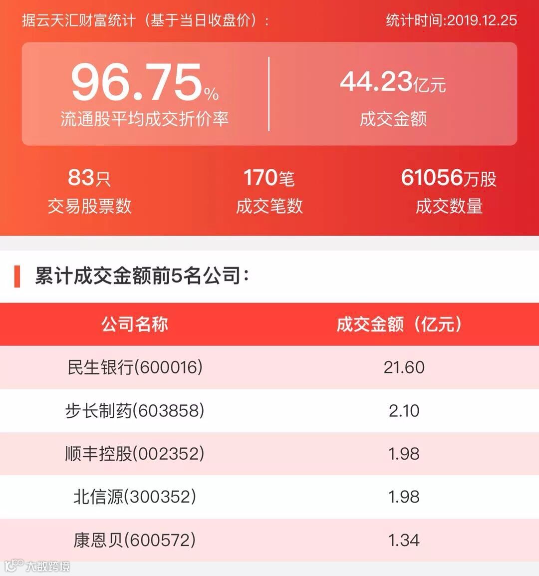 2019年12月25日,大宗交易成交金额44.23亿元,交易股票数83只,成交笔数170笔,流通股平均成交折价率96.75%,成交数量61056万股。