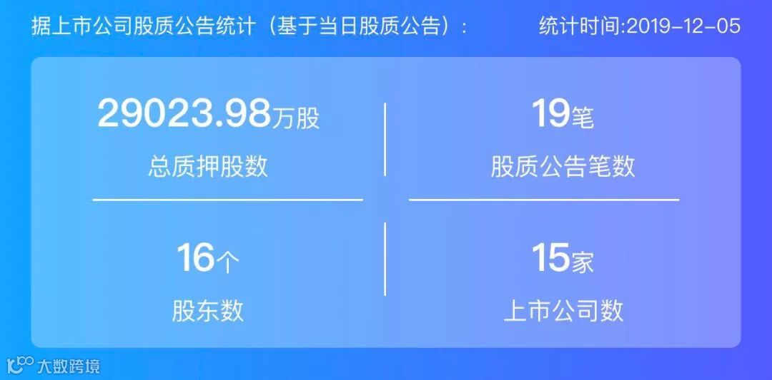 2019年12月5日,股票质押总质押股数29023.98万股,上市公司数15家,股质公告笔数19笔,股东数16个。