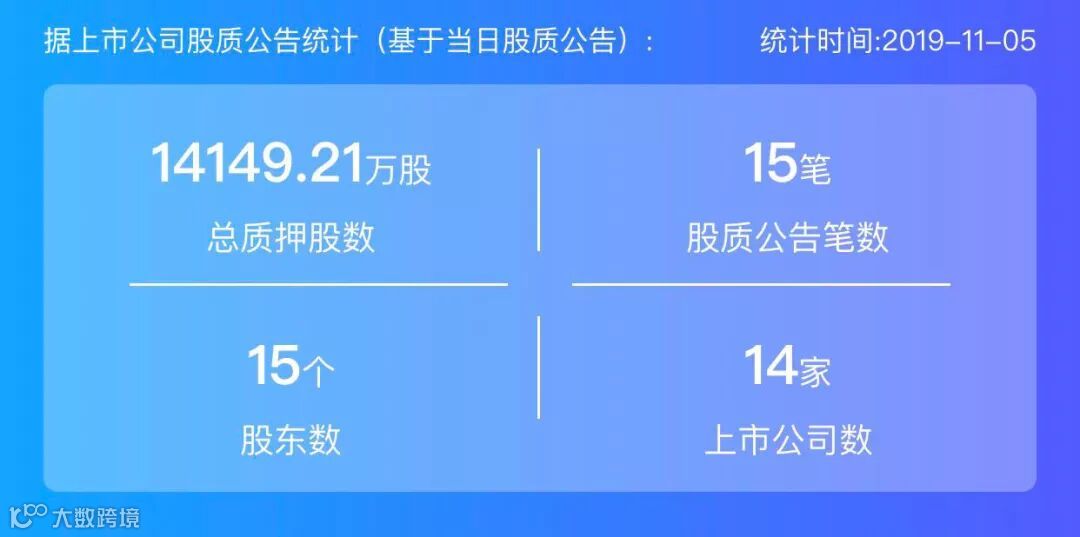 2019年11月5日,股票质押总质押股数14149.21万股,上市公司数14家,股质公告笔数15笔,股东数15个。