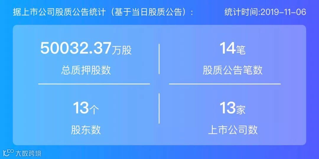 2019年11月6日,股票质押总质押股数50032.37万股,上市公司数13家,股质公告笔数14笔,股东数13个。