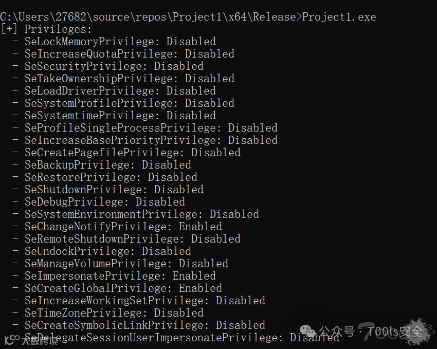 • 遍历所有权限,使用 LookupPrivilegeName 获取每个权限的名称,并检查权限是否启用。