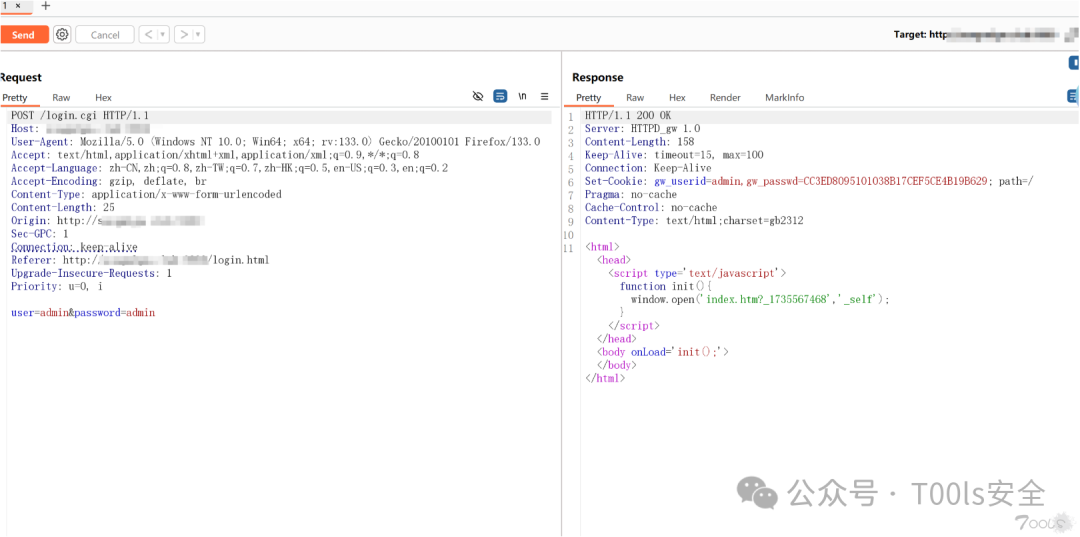 可以看到直接就RCE了。数据包当中存在cookie,显而易见,这个RCE是需要登录到后台才能触发的。算是有点鸡肋,不过不影响水漏洞,这款路由器还是有一定用户量的,所以不太方便说具体型号。