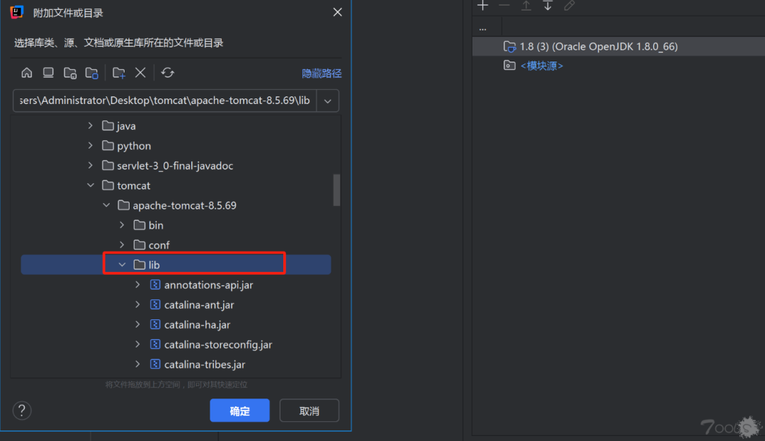 接下来导入tomcat对应的lib库,这样我们就可以在代码中使用tomcat的一些类