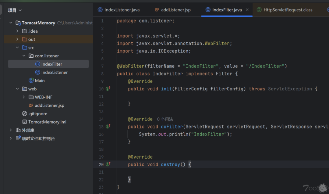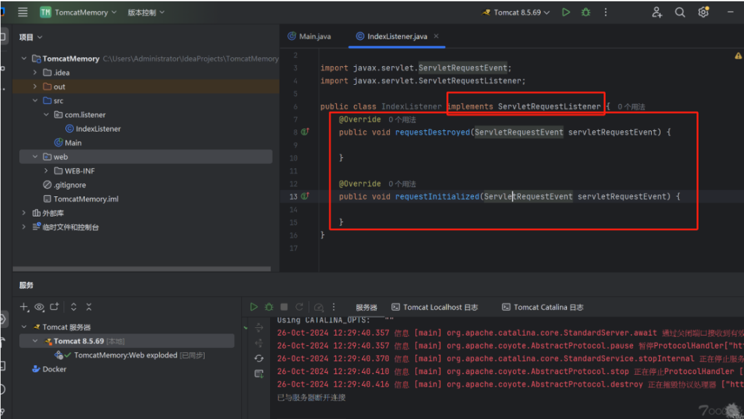 继承ServletRequestListener,并实现里面的方法,这里有两个函数,一个是Listener初始化时调用,另一个是销毁时调用。