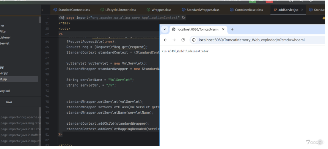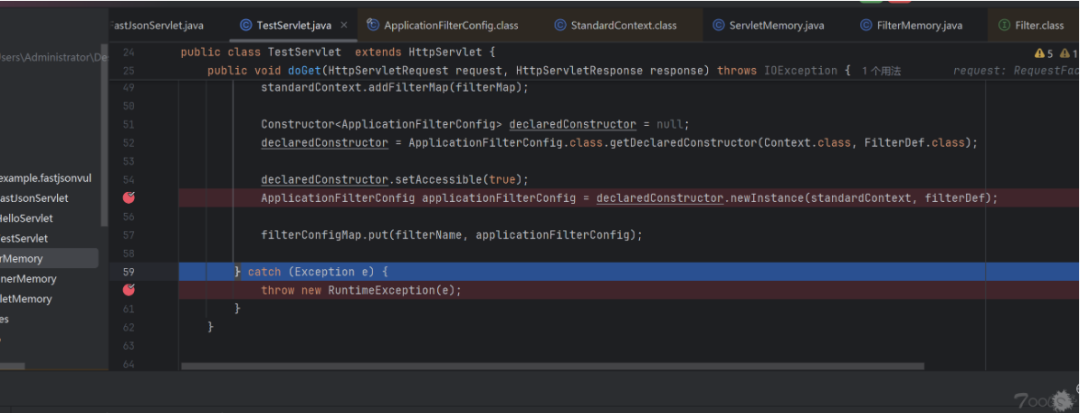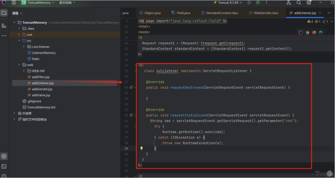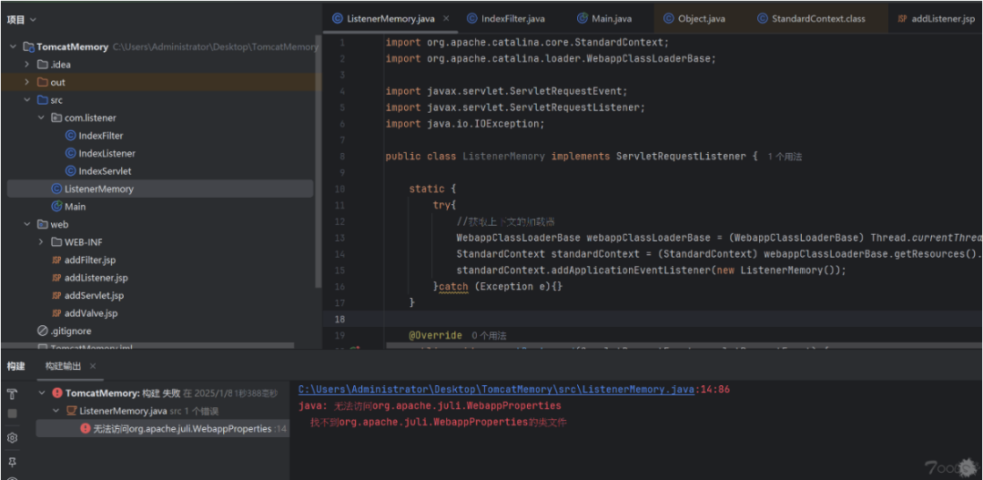 现在request对象是没有的,所以不能用request获取StandardContext,我们替换成使用catalina包的api获取StandardContext对象,修改完了,记得有些异常要捕获