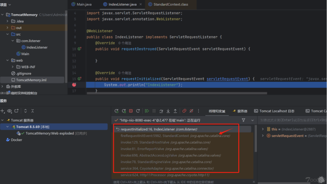 我们看一下堆栈调用情况,当前IndexListener#requestInitialized是通过StandardContext#fireRequestInitEvent里面调用的