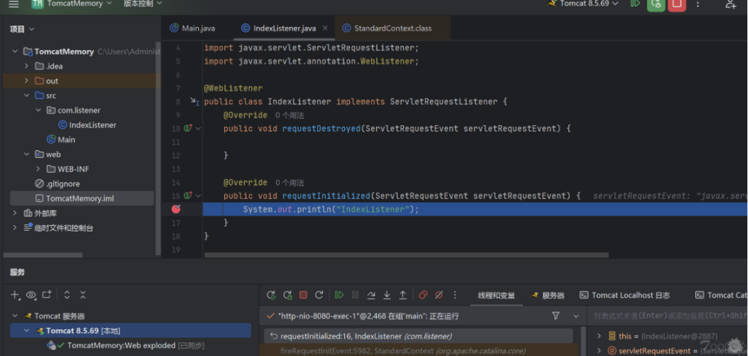 写上WebListener注解,这样不用在web.xml去配置。我们在初始化时输出一句话,并打上断点,使用debug模式启动。