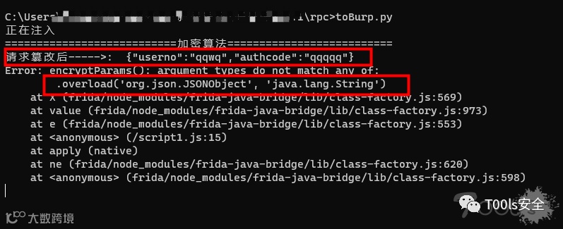 而我们在将JSONObject json发送到burp的时候,将JSONObject json类型转换为了String,导致调用encryptParams方法进行加密的时候,JSONObject json这个参数转换为了string类型的,所以匹配不到,故提示要重载。