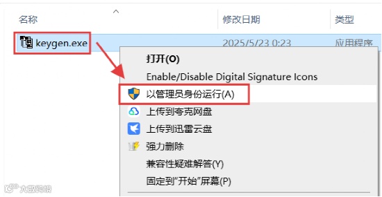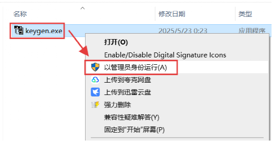 12.选中【keygen】程序,鼠标右键选择【以管理员身份运行】。(如果打开此文件夹为空,则是解压时被杀毒软件或者系统防护拦截删除了,退出杀毒重新解压即可)