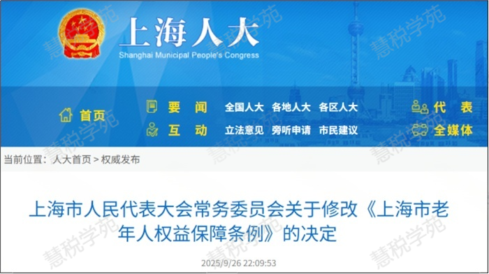 9月25日,上海市十六届人大常委会第24次会议表决通过了关于修改《上海市老年人权益保障条例》的决定,新修改的条例自2025年11月1日起施行。