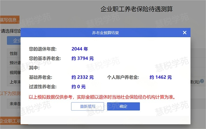 (注:这个计算器,只是根据我们的假设数据,推算出最终退体金。实际情况,可能和我们推算的会有差别,因此,只能做个参考,大致了解一下。举例仅供参考,每个人的养老金根据当地工资水平、缴费年限、缴费档次的不同,而不一样。)