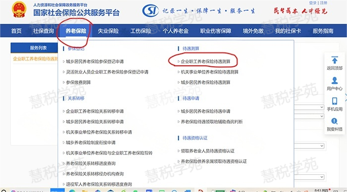第一步:登录“国家社会保险公共服务平台”,找到“养老保险-企业职工养老保险待遇测算”。