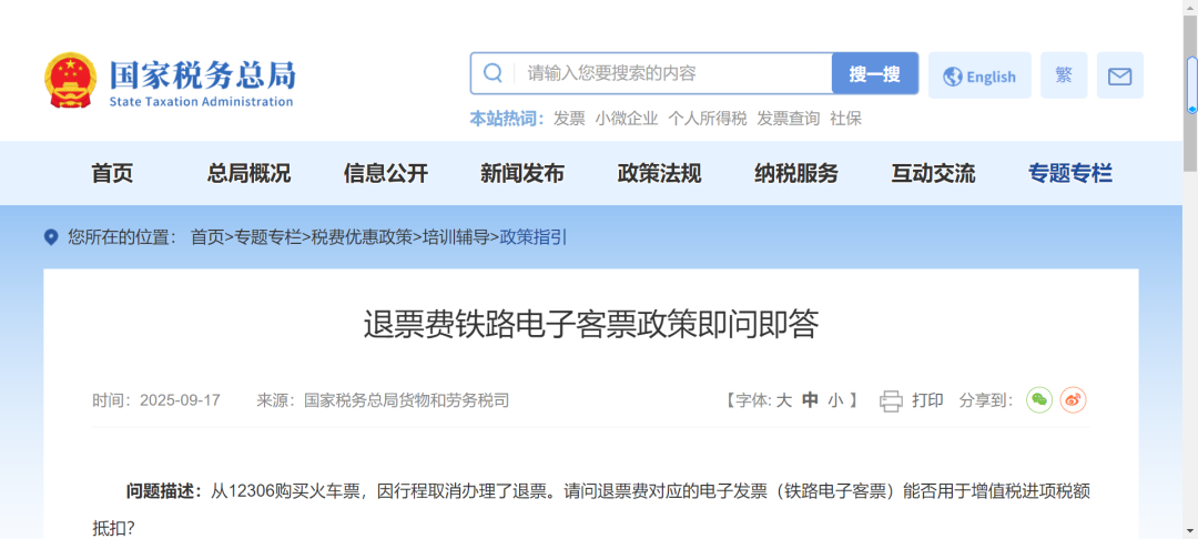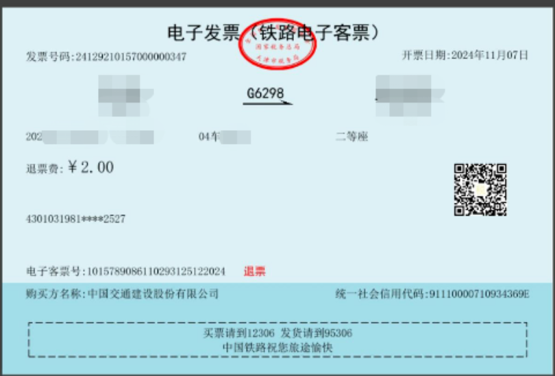 答复口径:按照《国家税务总局 财政部 中国国家铁路集团有限公司关于铁路客运推广使用全面数字化的电子发票的公告》(2024年第8号)规定,国铁集团所属运输企业、非控股合资公司以及地方铁路企业(统称铁路运输企业)通过铁路客票发售和预定系统办理境内旅客运输售票、退票、改签业务时,可开具电子发票(铁路电子客票)。铁路运输企业办理退票业务开具的电子发票(铁路电子客票)具有抵扣功能,购买方为增值税一般纳税人的,可进行用途确认,按规定办理增值税进项税额抵扣。