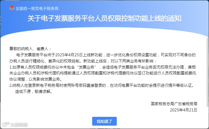 最近,不少企业办税人员在登录电子税务局,准备开具数电发票时,突然被系统弹窗提示 “您没有该功能访问权限,请联系法定代表人或财务负责人添加权限”。