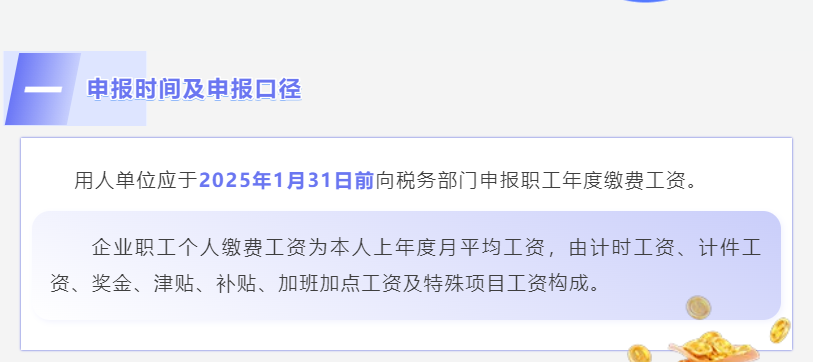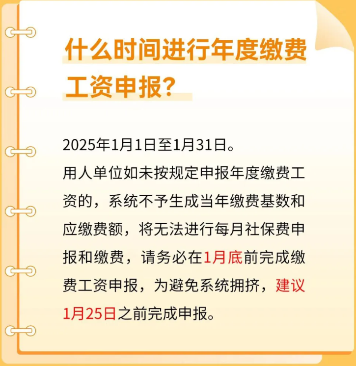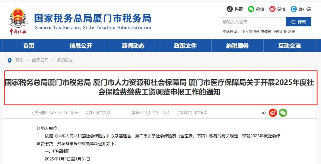 依据《中华人民共和国社会保险法》以及福建省、厦门市关于社会保险费(含医保,下同)缴费的有关规定,2025年度社会保险费缴费工资调整申报已经开始啦!申报时间为2025年1月1日至1月31日。