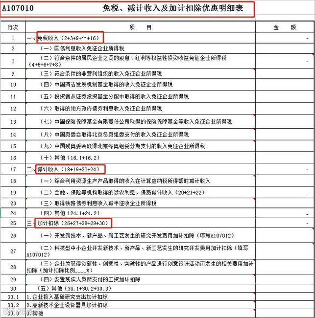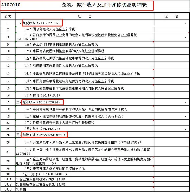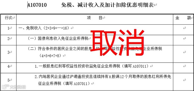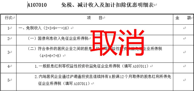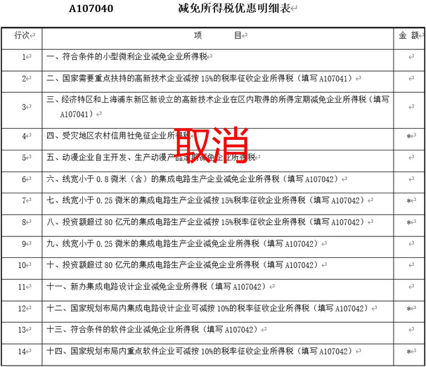 取消《免税、减计收入及加计扣除优惠明细表》(A107010)、《减免所得税优惠明细表》(A107040)。