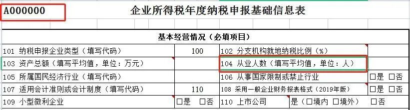 8、纳税人年度申报时,《企业所得税年度纳税申报基础信息表》(A000000)中“104从业人数”若与季度预缴申报表填报的全年从业人数平均值不一致,且导致小型微利企业标志发生改变的,应先更正第四季度预缴申报表。