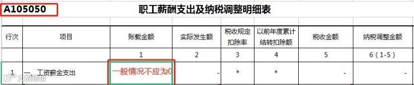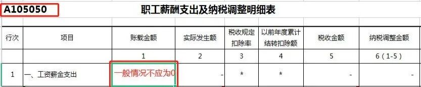 5、一般情况下,《职工薪酬支出及纳税调整明细表》第1行第1列“工资薪金支出-账载金额”不应为0。