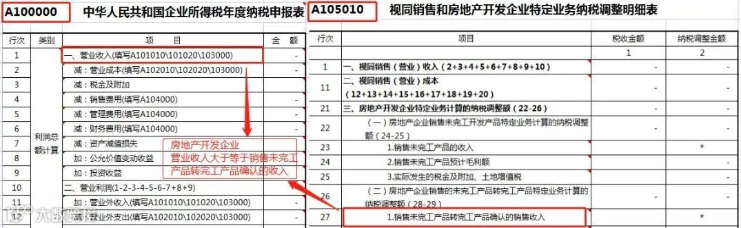 4、一般情况下,房地产开发企业年度纳税申报表主表(A100000)第1行“营业收入”应大于或等于《视同销售和房地产开发企业特定业务纳税调整明细表》(A105010)第27行“销售未完工产品转完工产品确认的销售收入”金额。