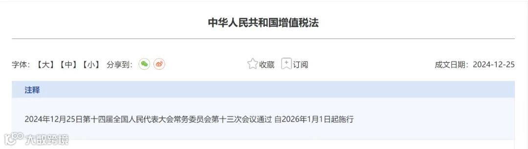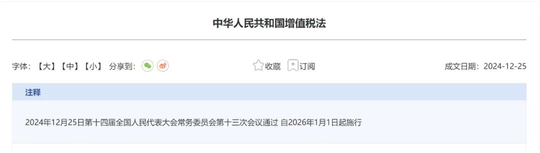 2024年12月25日,第十四届全国人民代表大会常务委员会第十三次会议通过了《中华人民共和国增值税法》,宣布自2026年1月1日起开始实施。