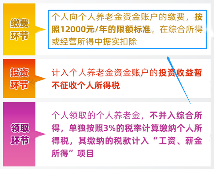自2022年1月1日起,在缴费环节,个人向个人养老金资金账户的缴费,按照12000元/年的限额标准,在综合所得或经营所得中据实扣除;