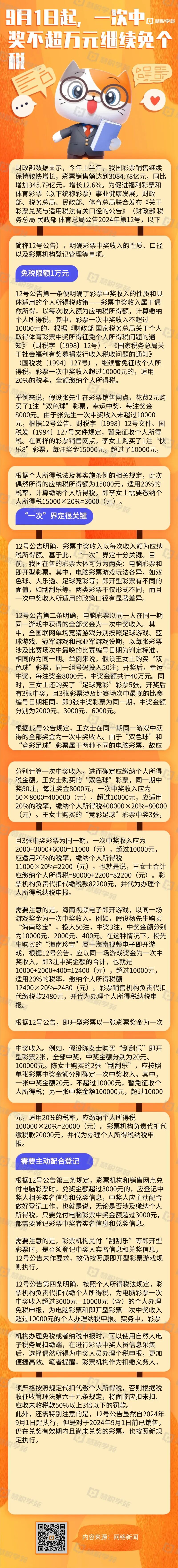 9月1日起,一次中奖不超万元继续免个税