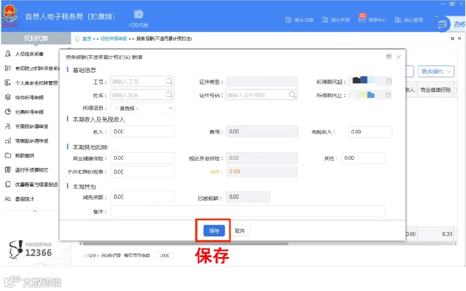 第二步:在左侧点击【综合所得申报】,进入【收入及减除填写】模块,根据实际情况选择“劳务报酬(不适用累计预扣法)”或者“劳务报酬(适用累计预扣法)”,点击右方【填写】,录入相关信息后点击【保存】。