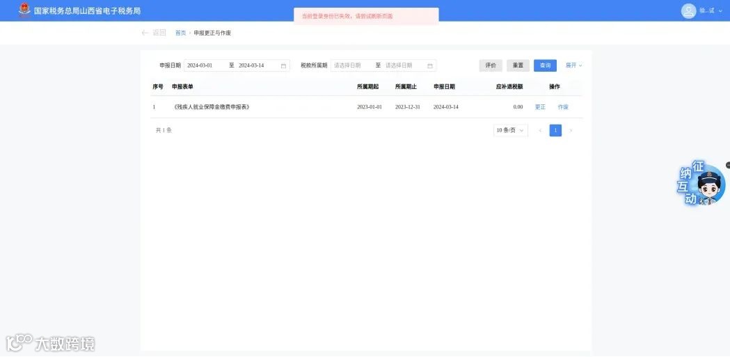 第三步、纳税人从查询结果列表中,通过“操作”列提供【更正】、【作废】完成对应申报表单的相关操作。