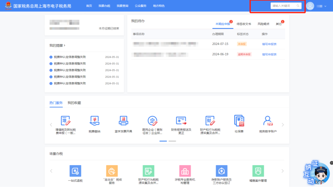 进入新电子税局首页,在页面右上方搜索框输入关键字,即可快速找到办税功能。