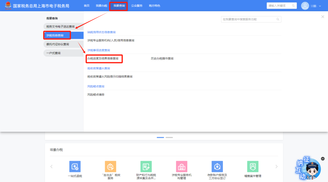 登录新电子税局后,点击【我要查询】-【涉税信息查询】-【涉税事项进度查询】-【办税进度及结果信息查询】,即可查询事项办理进度及结果。