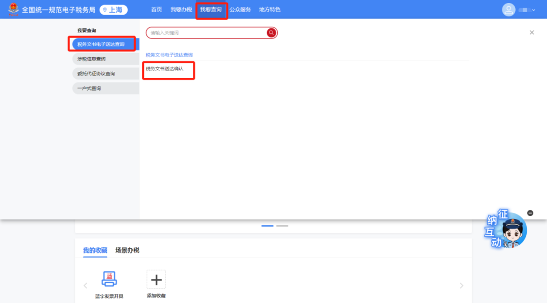 登录新电子税局后,您可点击【我要查询】-【税务文书电子送达查询】-【税务文书送达确认】,选择文书种类、送达起止日期、是否已查阅等条件,点击【查询】查询已送达的文书。
