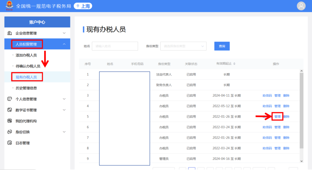 ②在账户中心中点击【人员权限管理】,在下拉菜单中点击【现有办税人员】,选择需要变更权限的人员的操作列表中点击“管理”。