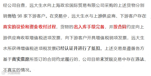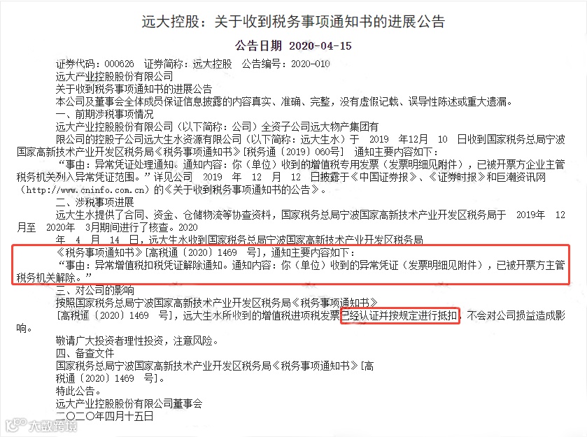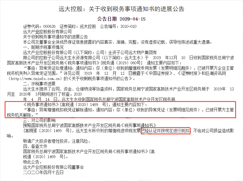 看到没?今年4月远大生水又收到一份《税务事项通知书》内容如下:“事由:异常增值税扣税凭证解除通知。通知内容:你(单位)收到的异常凭证(发票明细见附件),已被开票方主管税务机关解除。”