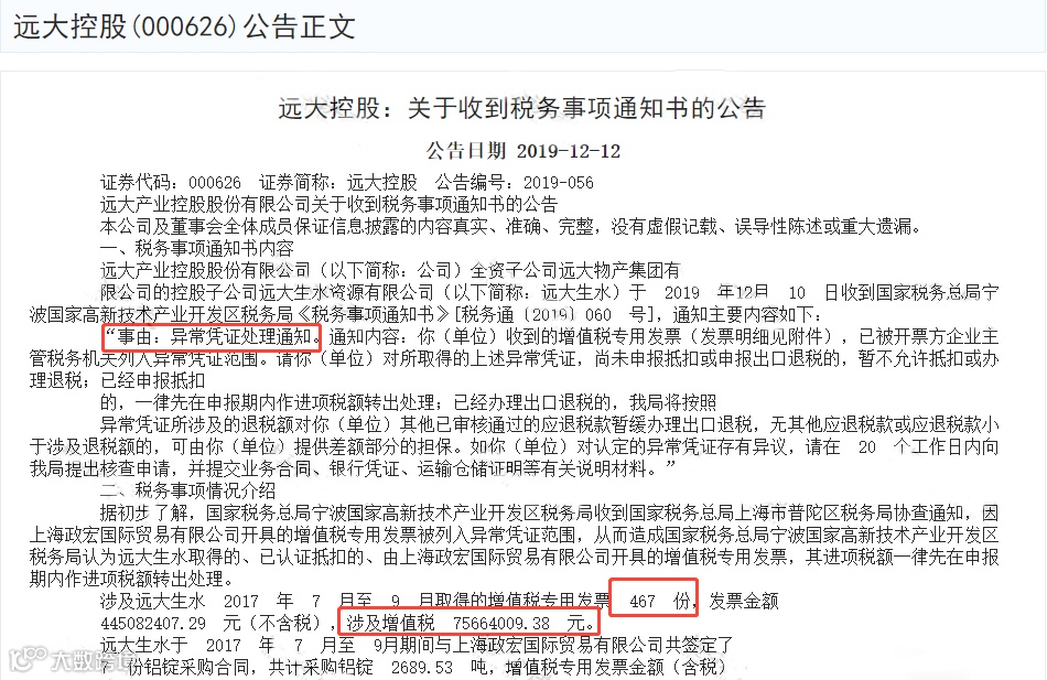 2019年12月,远大生水公司接到了宁波税务局发出的《税务事项通知书》,因远大公司收到的上海政宏公司开具的增值税专票467份,涉及增值税75,664,009.38元。已被开票方企业(即上海政宏公司)主管税务机关列入异常凭证范围。根据相关规定,远大生水公司已认证抵扣的,其进项税额一律需要作进项税额转出处理。这就导致远大生水公司需要补税7566万元。