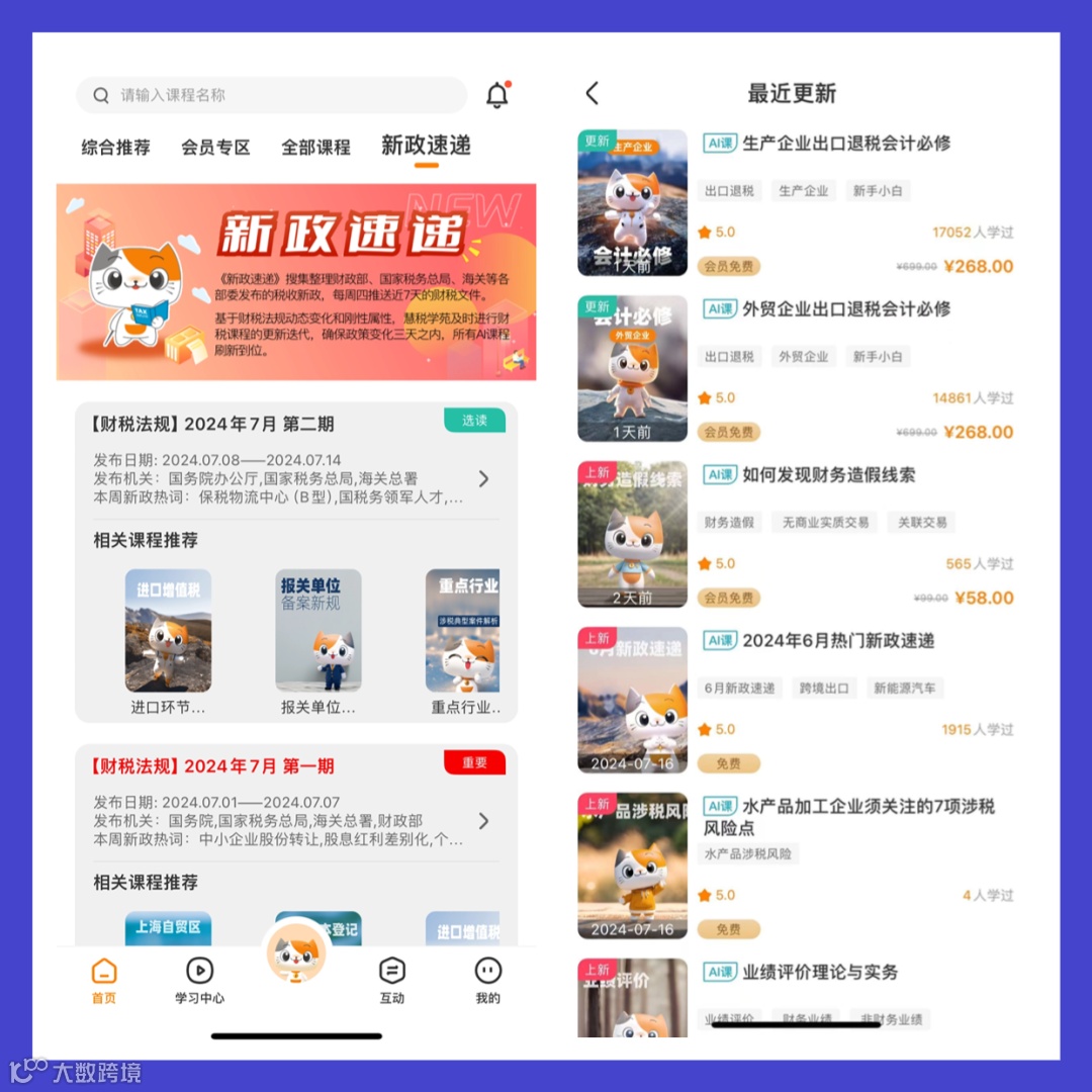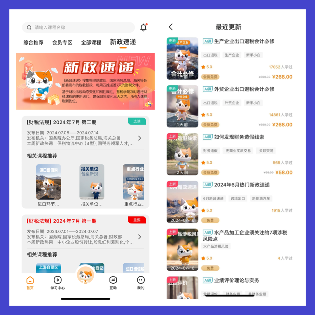 看就看及时的、准确的、全面的!慧税学苑通过强大的AI技术支持,快速响应政策更新,实现政策变化三天之内,所有AI课程刷新到位,刷文本即刷课程。既能全方位保障课程时效性和准确性,给予用户稳定预期,又可以法规、案例与课程紧密关联,更新情况一目了然。