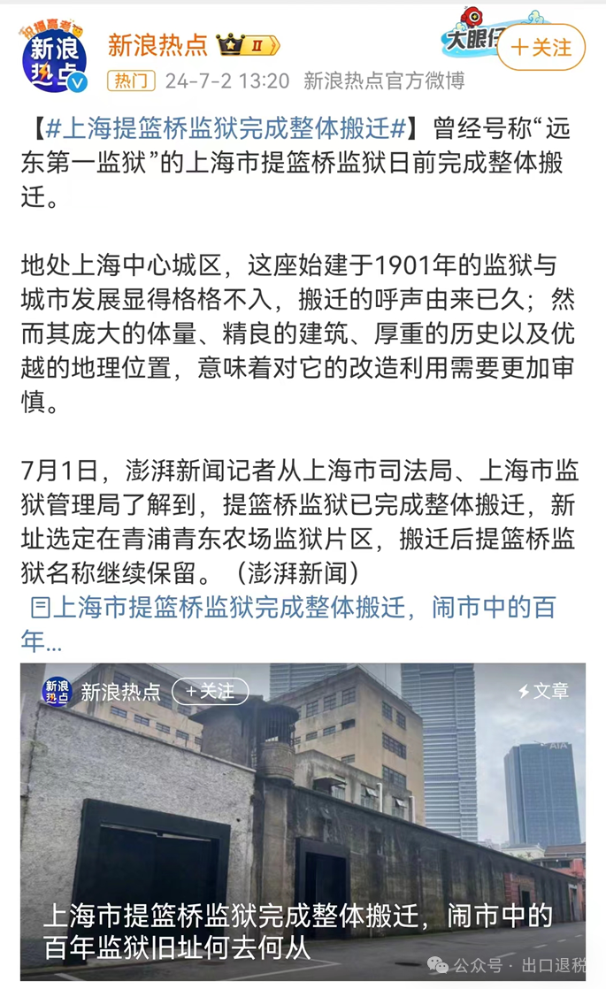 据澎湃新闻2024年7月2日报道,上海市提篮桥监狱日前完成整体搬迁,新址选定在青浦青东农场监狱片区,搬迁后提篮桥监狱名称继续保留。此消息一出,便引发了财会圈儿的疯狂讨论。